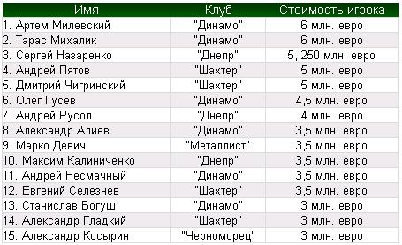 Всего среди 15 самых дорогих украинских игроков сразу шестеро представляют "Динамо", четверо — донецкий "Шахтер", трое играют за днепропетровский "Днепр" и по одному за харьковский "Металлист" и одесский "Черноморец".