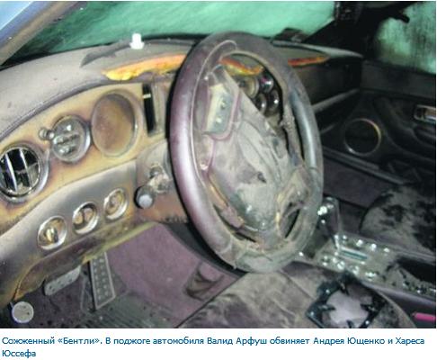 СВИДЕТЕЛЬ. Спустя 4 года после этого конфликта Валид Арфуш заявил, что он располагает свидетельствами человека, который в свое время работал на Юссефа и который по поручению последнего и организовал поджог "Бентли" (в настоящий момент машину правоохранительные органы отдали Валиду и тот собрался ее отремонтировать). "Он мне рассказал, что Юссеф выделил ему 70-75 тысяч долларов и сказал, что надо проучить Арфуша. Мол, они вместе с Андреем Ющенко хотели дать мне урок. В свою очередь этот человек нашел троих исполнителей, которые не являются украинцами. У него, кстати, сохранились копии их паспортов".