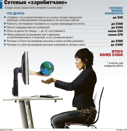 В сети текут реки денег — по примерным подсчетам, доход от интернет-бизнеса в прошлом году составил более 700 млрд. долларов. Оказывается, небольшой ручеек от такого потока можно направить и к себе — немало наших соотечественников уже "ходят" в сеть как на работу, предпочитая трудиться на себя в подходящее время, без офисов и начальников. Как показывает их практика, заработать уже через несколько месяцев можно около 400 долларов. Привлекает многих также то, что для начала не надо абсолютно никаких вложений средств, а для работы понадобится минимум "инструментов" — всего лишь компьютер с хорошим доступом в интернет и свободное время.