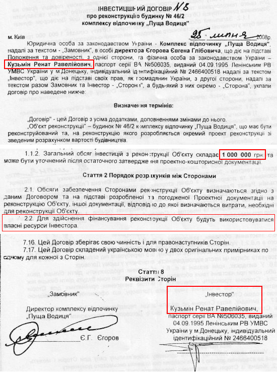Інвестиційний договір між Ренатом Кузьміним і комплексом відпочинку "Пуща Водиця", який потрапив у розпорядження "Української правди", порушує також інше запитання — звідки прокурор бере гроші на ці роботи.
