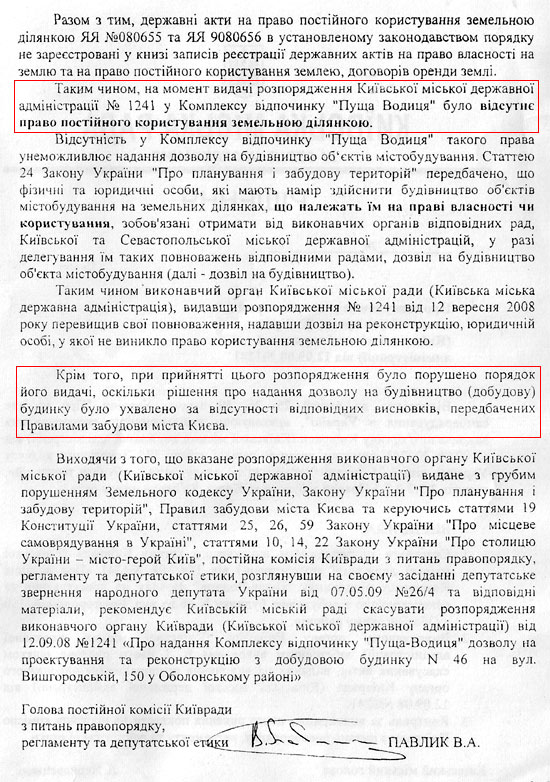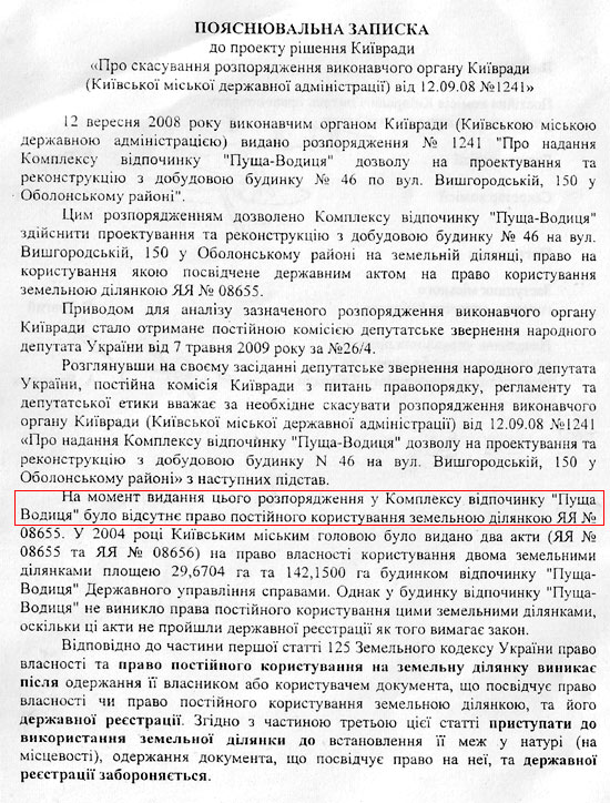 "На момент видачі розпорядження КМДА у комплексу відпочинку "Пуща Водиця" було відсутнє право постійного користування земельною ділянкою, — стверджує він. — Виходячи з того, що розпорядження видане з грубим порушенням, комісія рекомендує Київраді скасувати розпорядження КДМА (про надання дозволу Кузьміну на проектування та реконструкцію будинку)".