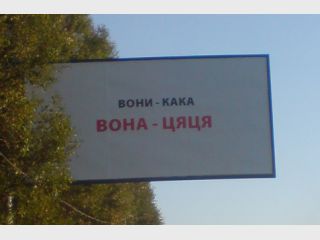 Примерно в 60-70 км от Киева на трассе красуются два плаката, на которых сообщается, что "Вона працює — Кремлю звітує" и "Вона працює — армія голодує". Кстати, в Харькове появились еще более вызывающие билборды: "Вони — кака, вона — цяця".