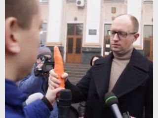 Но телеведущий на этом не остановился. Он преследовал Яценюка и дальше, пытаясь вручить ему еще одну морковку. Однако крепкие охранники больше не допустили Дурнева к оппозиционеру.