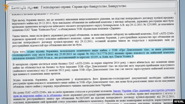 Але з відкритих документів цієї справи, проаналізованих незалежними юристами на прохання Радіо Свобода, виглядає так, що "Київське автотранспортне підприємство-2240" передало майно ТОВ "Про Девелопмент тім", щоб не віддавати майже 23 тисячі квадратних метрів території банку.